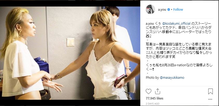 Diva Jepang Ayumi Hamasaki mengagetkan penggemarnya dengan mengunggah foto bersama dengan diva Jepang lainnya, yaitu Koda Kumi. Dalam unggahannya tersebut, penyanyi yang sering dipanggil Ayu itu menulis kalau dirinya dan Koda Kumi tidak sengaja bertemu di dalam sebuah lift.